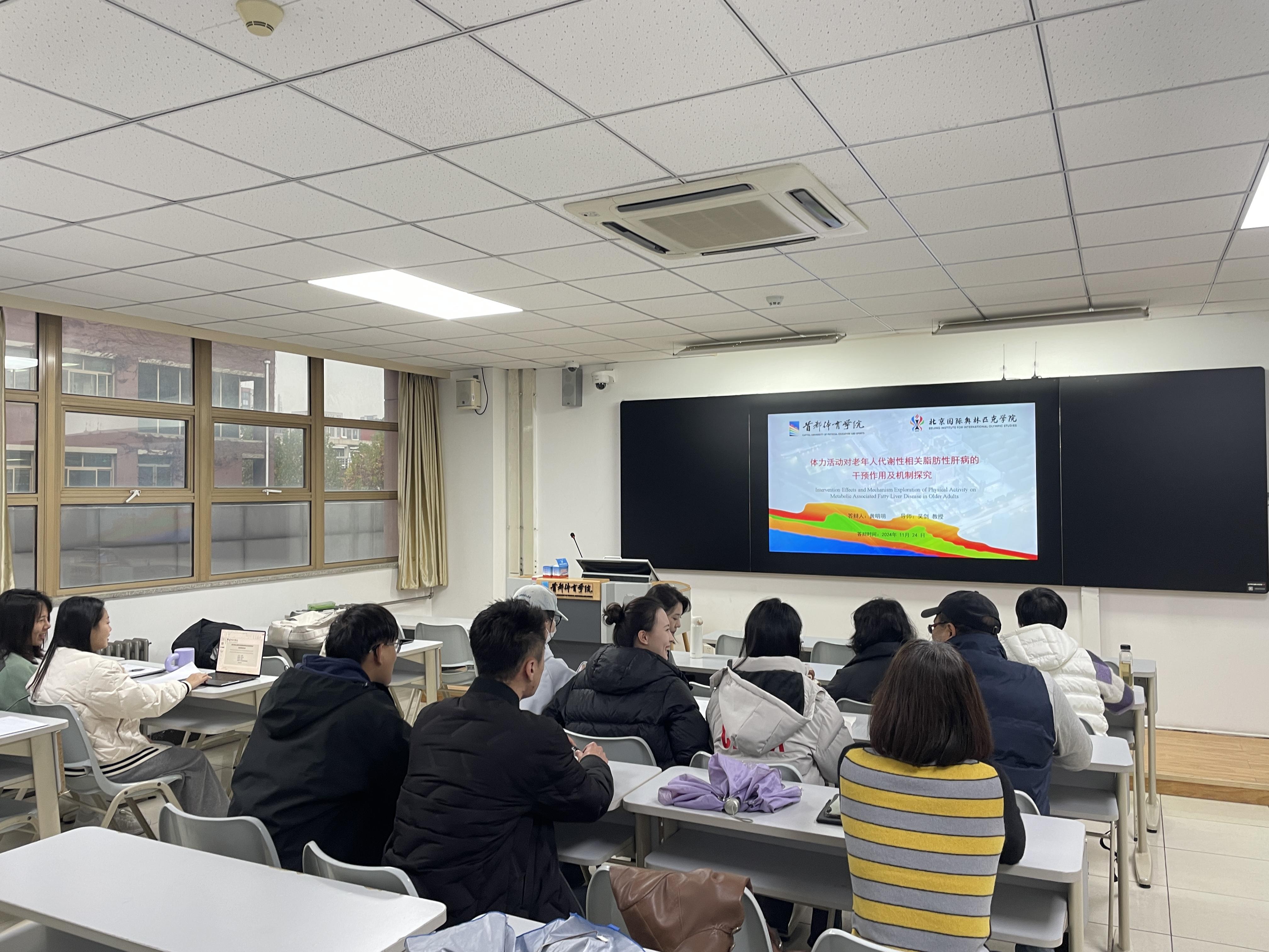 黄明明以“体力活动对老年人代谢相关性脂肪肝病的干预作用及机制探讨”为题介绍了不同体力活动干预方式对老年人代谢相关性脂肪肝病的干预作用,并从肠道菌群的角度探究其改善机制。马静以“有氧运动对睡眠障碍成年人学习记忆功能的影响及作用机制研究”为题介绍了有氧运动作为一种调节因素,对睡眠障碍成年人学习记忆功能的干预作用,并从外周运动因子角度阐明其生物学机制。随后现场师生围绕研究内容和研究设计进行了交流和讨论,现场同学还对如何进行开题报告提出了疑问,主讲人一一进行解答。