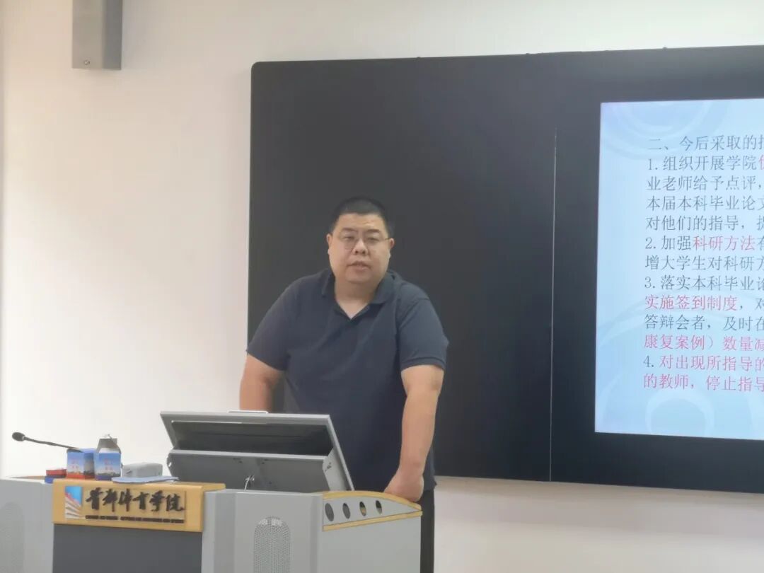 为落实“三全育人”要求,强化本科毕业论文规范化管理、提升论文质量,5月30日下午,360足球直播比分 组织召开“提升本科论文质量”专题工作会暨2025届本科毕业论文工作总结会。360足球直播比分 领导班子成员、各教研室主任及2025届本科毕业论文(运动康复案例)指导教师参会。